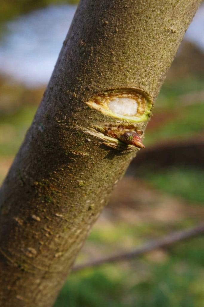 - Using a sharp knife, remove a 2-mm wide strip of bark above the bud without damaging the bud itself